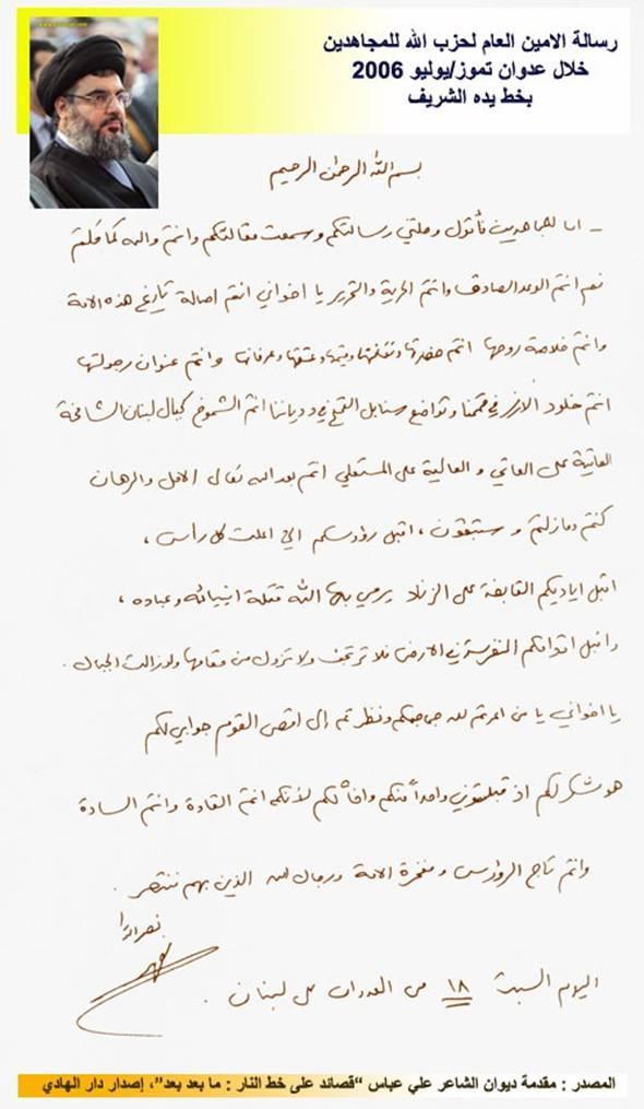 على أبواب الانتصار الالهي: رسالة الامين العام لحزب الله للمجاهدين خلال عدوان تموز 2006 بخط يده الشريف.