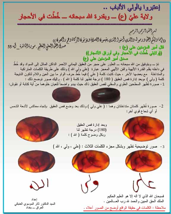 لقد عثر على فص من العقيق اليماني مكتوب من داخله بقدرة الواحد الاحد جملة (( علي ولي الله)) مع خاتم اخر مكتوب فيه (( الله محمد علي)) وهذه الاحجار موجوده ولقد اطلعت عليها بنفسي (( ولو اتيتهم بكل اية اعرضوا وقالوا سحر مستمر )) وهاذه هي روابط ادخل وشاهد العجائب وصدق امير المؤمنين حين قال (( ولايتي خطت بالحجار وعلى اوراق الاشجار )) http://www.shiaee.com/vb/attachment....1&d=1189842877