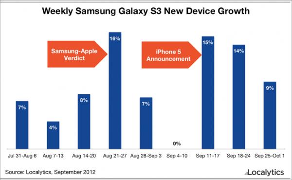 كشفت دراسة نشرتها شركة Localyticsحول مبيعات هاتف Samsung Galaxy S III عن أرقام قد تبدو مُفاجئة للكثيرين، وربما لآبل نفسها. حيث أشارت الأرقام إلى أن مبيعات سامسونج من هاتف S III ارتفعت بنسبة 16% خلال الأسبوع الذي حكمت فيه المحكمة الأمريكية ضد سامسونج وفرضت عليها دفع غرامة تفوق المليار دولار لشركة آبل.