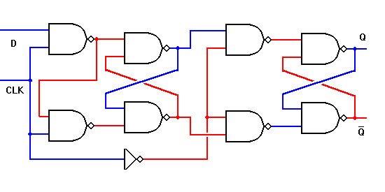 The edge-triggered D flip-flop is easily derived from its RS counterpart. The only requirement is to replace the R input with an inverted version of the S input, which thereby becomes D. This is only needed in the master latch section; the slave remains unchanged.