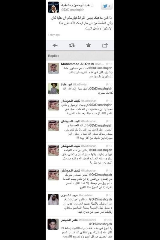 ماذا تقولون في الناصبي ابن ست الدمشقية لعنه الله في قوله هذا في التوتير لأصحابه
