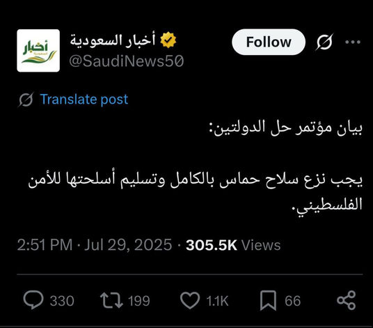 طلب اسرائيل بنزع سلاح حماس , تمثله السعودية تماما