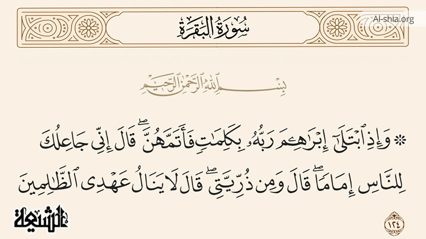 المعنى: أي: واذكر -أيها النبي- حين اختبر الله إبراهيم بما شرع له من تكاليف، فأدَّاها وقام بها خير قيام. قال الله له: إني جاعلك قدوة –إماما- للناس. قال إبراهيم: ربِّ اجعل بعض نسلي أئمة فضلا منك، فأجابه الله سبحانه أنه لا تحصل للظالمين الإمامةُ في الدين. و”العهد” يشير إلى المنصب الإلهي للإمامة، أي النيابة عن الله في هداية البشر وتوجيههم. هذا العهد لا يُمنح للظالمين، بل هو لمن يستحقه بالصفات التي تجعله مؤهلاً للإمامة، مثل العلم والتقوى والعصمة.