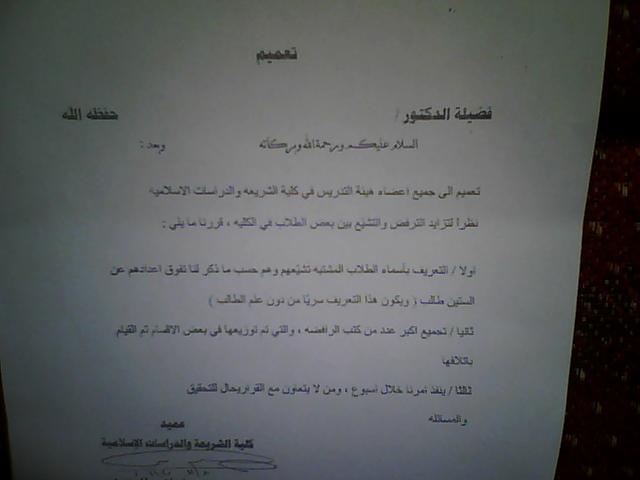 تعميم الى جميع اعضاء هيئة التدريس في كلية الشريعة والدراسات الاسلامية