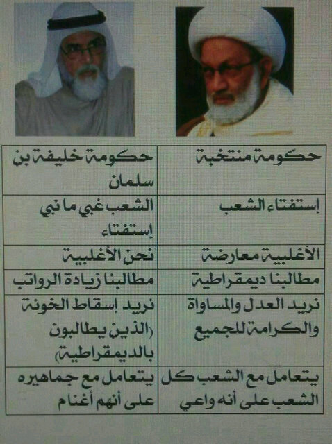 صورة تبين الفرق بين فكر سماحة الشيخ عيسى أحمد قاسم و المحمود رغم ان من يسمى المحمود (الامحمود) لا يستحق أن يكون في مستوى المقارنة مع طفل بحريني مقاوم ، ولكن لمن يعتبر ان المحمود قائد الشارع السني ( المجنس من ايران يستنكر من اصله ويعيب الاخرين بنسبه ) فيرى ما يطالب به هذا المعتوه ، في المقابل يرى ما يطالب به الشارع المعارض على لسان سماحة الشيخ ، وهي المطالب التي تحفظ كرامة المواطن . https://pbs.twimg.com/media/BDuu-AnCUAA7fUF.jpg:large |
