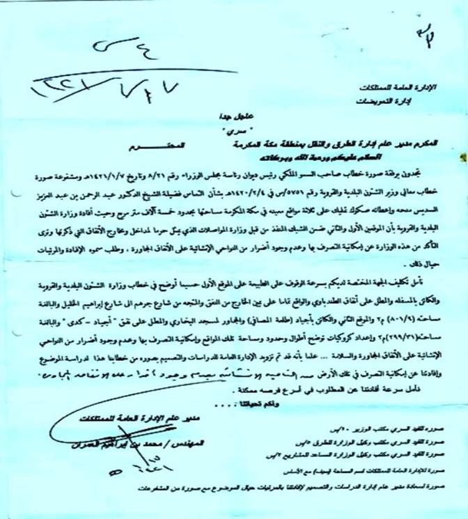 تجدون برفقة صورة خطاب صاحب السمو الملكي ديوان رئاسة مجلس الوزراء رقم 21/8 وتاريخ 7/1/1421 ومشفوعة صورة معالي وزير الشئون البلدية والقروية رقم 5751/ص في 4/2/1420 بشأن التماس فضيلة الدكتور الشيخ عبد الرحمن بن عبد العزيز السديس منحه وإعطائه صكوك تمليك على ثلاثة مواقع معينة في مكة المكرمة مساحتها بحدود خمسة آلاف متر مربع وحيث افادة وزارة الشئون البلدية والقروية بأن الموقعين الأول والثاني ضمن الشيك المنفذ من قبل وزارة المواصلات الذي يمثل حرما لمداخل ومخارج الأنفاق التي ذكرتها وترى التأكد من هذه الوزارة من إمكانية التصرف بها وعدم وجود أضرار من النواحي الإنشائية على الأنفاق المجاورة وطلب سموه الإفادة والمرئيات حيال ذلك..