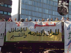 المظاهرة كانت تحت رعاية منظمة آيريس ( خدمة الاعلام العراقي ) التي تدعو الى مساندة المقاومة العراقية البطلة والمطالبة بخروج القوات الأمريكية من العراق مع أذنابها من الحكومة العراقية المجرمة العميلة كما أعدت منظمة آيريس برنامجا لهذه التظاهرة ، كما شارك في المظاهرة مجموعة من جمعيات شبكة ضد الحرب المؤلفة من العديد من الجمعيات والأحزاب السويدية والأمريكية الجنوبية والأفريقية..