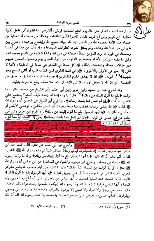 و أخرج ابن ابي حاتم و ابن مردويه و ابن عساكر عن ابي سعيد الخدري قال: نزلت هذه الآية "يا أيها الرسول بلغ ما أنزل إليك" على رسول الله صلى الله عليه و سلم يوم غدير خم في علي بن أبي طالب رضي الله عنه. و اخرج ابن مردويه عن ابن مسعود قال: كنا نقرأ على عهد رسول الله صلى الله عليه و سلم "يا أيها الرسول بلغ ما أنزل إليك من ربك أن عليا مولى المؤمنين و إن لم تفعل فما بلغت رسالته و الله يعصمك من الناس"