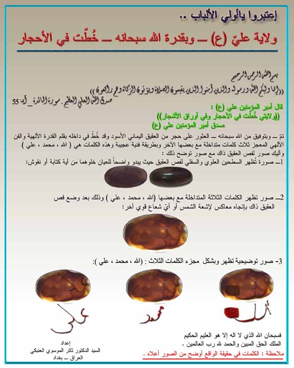 لقد عثر على فص من العقيق اليماني مكتوب من داخله بقدرة الواحد الاحد جملة (( علي ولي الله)) مع خاتم اخر مكتوب فيه (( الله محمد علي)) وهذه الاحجار موجوده ولقد اطلعت عليها بنفسي (( ولو اتيتهم بكل اية اعرضوا وقالوا سحر مستمر )) وهاذه هي روابط ادخل وشاهد العجائب وصدق امير المؤمنين حين قال (( ولايتي خطت بالحجار وعلى اوراق الاشجار )) http://www.shiaee.com/vb/attachment....1&d=1189842877