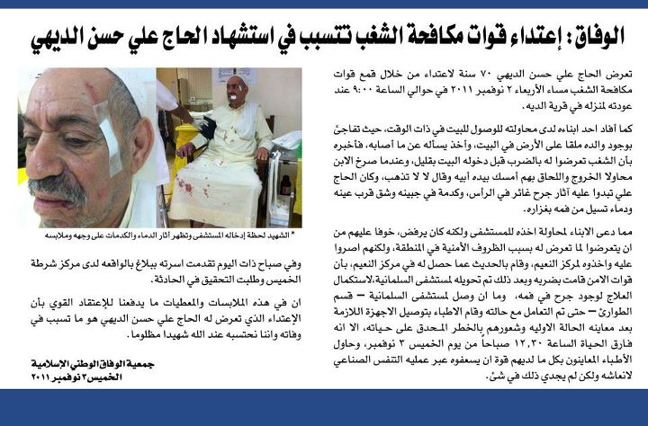 وقالت الجمعية على موقعها ان "علي حسن الديهي (70 عاما) تعرض لاعتداء من خلال قمع قوات مكافحة الشغب مساء الاربعاء .. عند عودته لمنزله في قرية الدية".