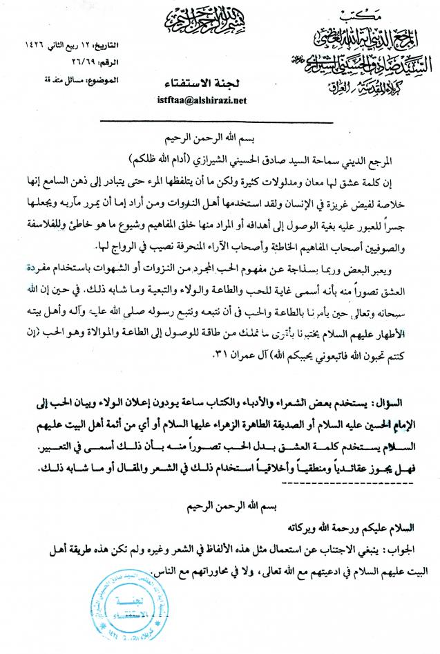 استفتاء السيد صادق الشيرازي في عدم جواز استخدام كلمة العشق مع الله ومع المعصومين عليهم السلام